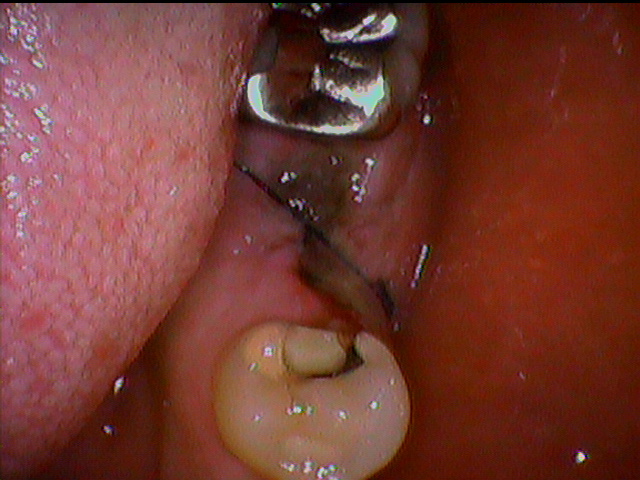 これが実際のお口の中では下のようなお画像になります。親知らずが少ししか出ておらず、通常の歯ブラシ等ではケアが困難なため清掃状態が悪く歯周炎などを生じてきます。